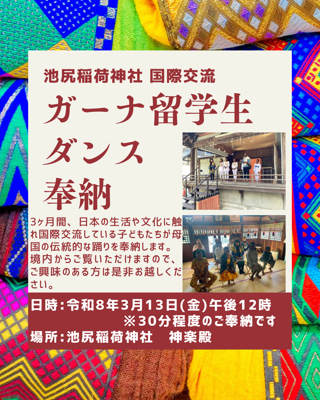 3月13日(金)「国際交流 ガーナ留学生ダンス奉納」のお知らせ